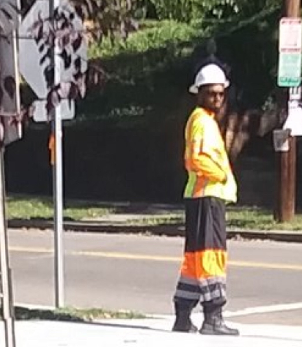 There were TWO TMI Flagmen not ONE as InDaCarSeat DaTGuY sat and watched the employed flagman re-appear at the site after he was caught by the journalist. That journalist also saw the lookalike flagman who may not have even been employed by TMI drive off in a white NISSAN Sedan car from the work site having parked towards the worksite on Blagden right directly next to where the real employee was stationed to work. There were two and no one would have seen that. Two bearded men – one that left was dark saw backing UP for the one in the photo while at the Hughes landscape working jelly. Found JELLO giggling all around him. Waving hi!