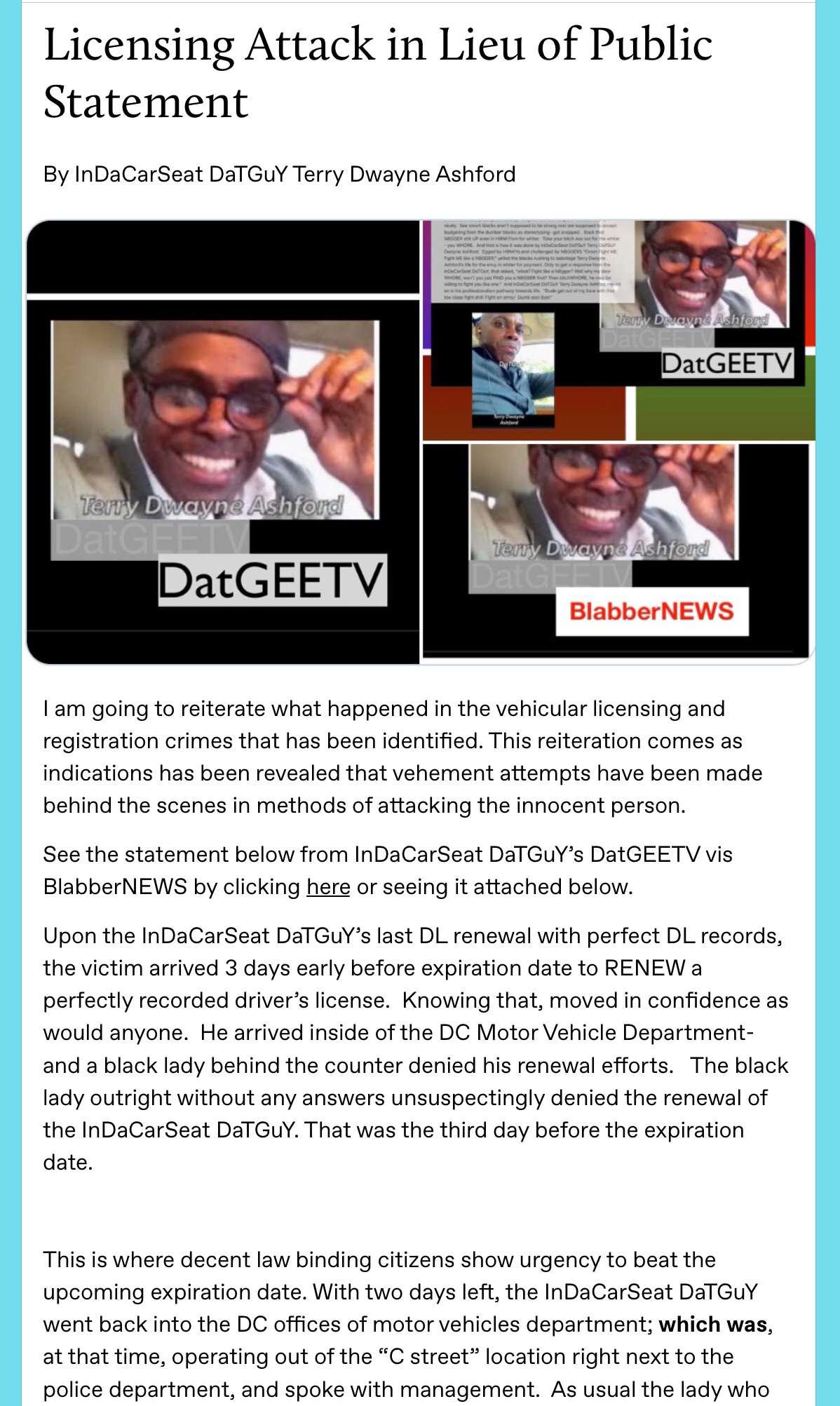 - InDaCarSeat DaTGuY Welcomes NEWS by Terry Dwayne Ashford supporting BlabberNEWS Magazine