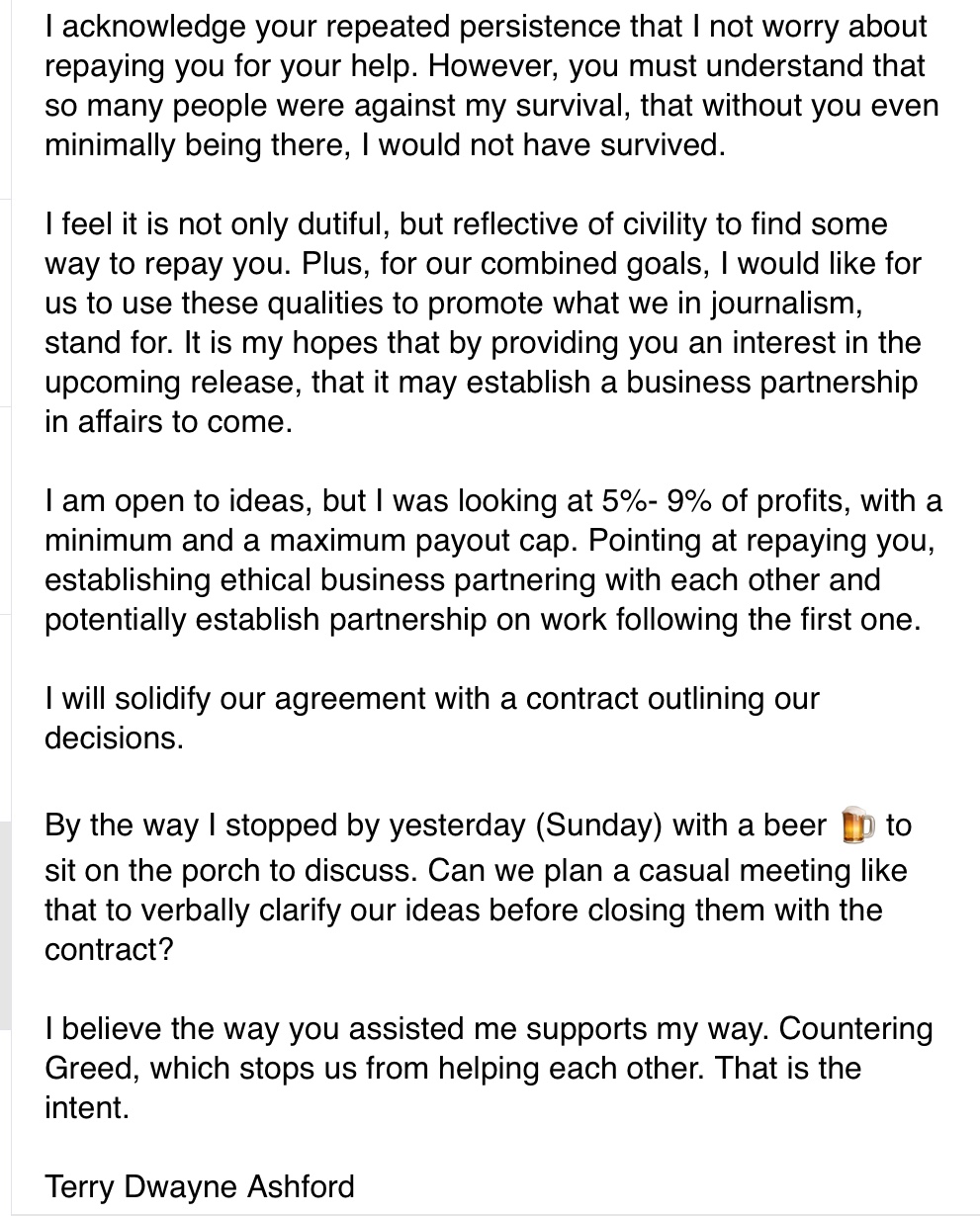 The more-than-ten year friendship with a man named Shongo was being used by the crimes to attack the journalist due to his closeness to the targeted person. Shongo was following the InDaCarSeat DaTGuY as a friend for the purpose to avenge losses of the gang-like team to the victims. This victim this time was the journalist InDaCarSeat DaTGuY Terry Dwayne Ashford, another targeted “Ashford”.
