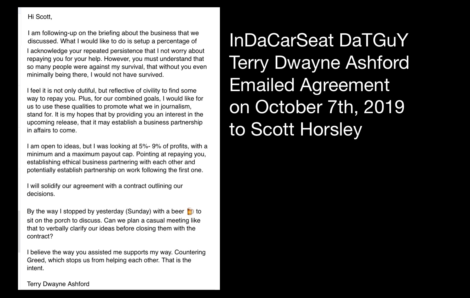 The Seven facts that indicate the need for this clarification about the friendship between Scott Horsley and the InDaCarSeat DaTGuY Terry Dwayne Ashford.