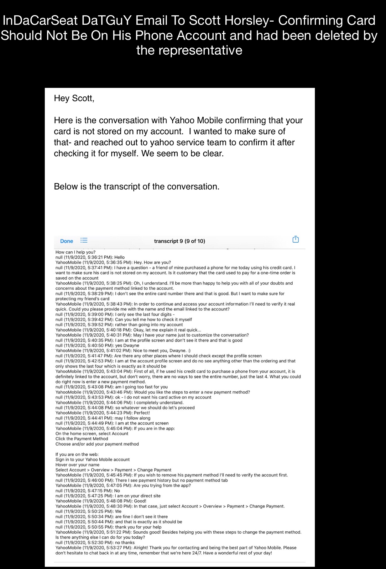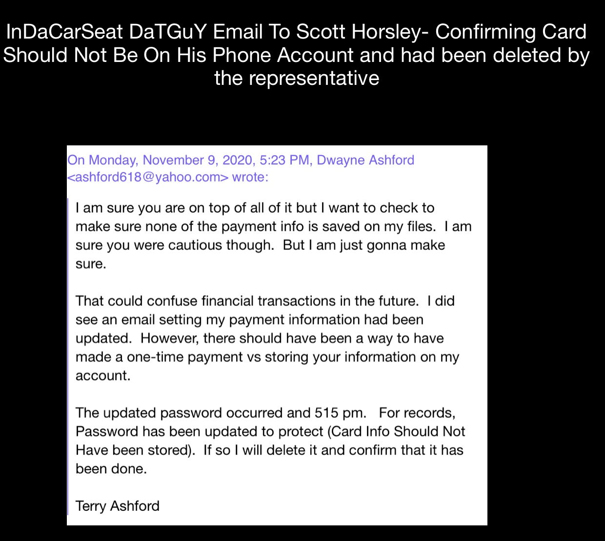 6. Payer of a recent mobile phone service showed that Scott Horsley’s card for a one-time payment was left attached to Terry Dwayne Ashford’s phone account. That was taken off by InDaCarSeat DaTGuY terry Dwayne Ashford. Transcript attached.