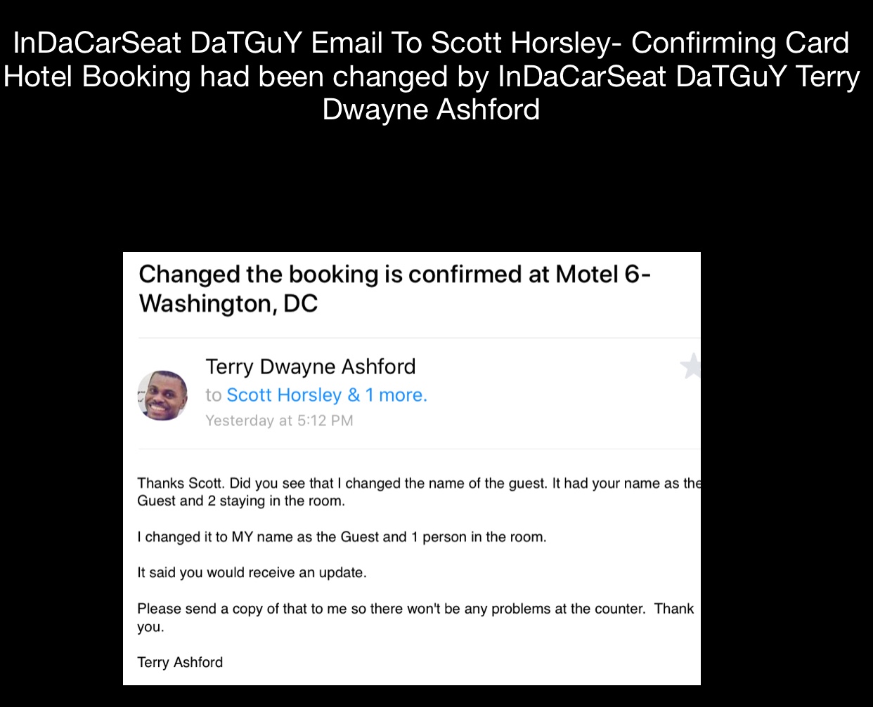 1. Hotel Stay at the last three hotels paid by my friend Scott Horsley has indicated some type of mistake that would have made a person believe that 2 people were staying in the room with InDaCarSeat DaTGuY Terry Dwayne Ashford. When each time it was corrected to reflect that only InDaCarSeat DaTGuY Terry Dwayne Ashford stayed in the room.